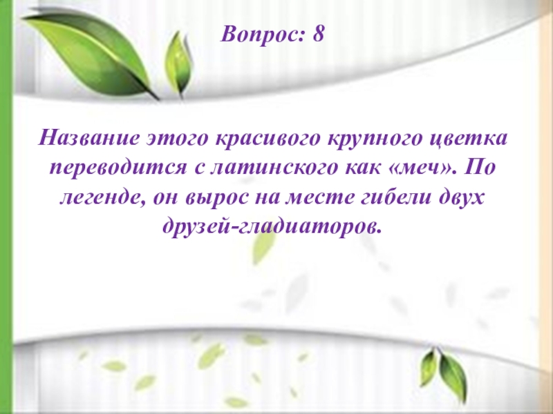 Вопрос: 8Название этого красивого крупного цветка переводится с латинского как «меч». По легенде, он вырос на месте