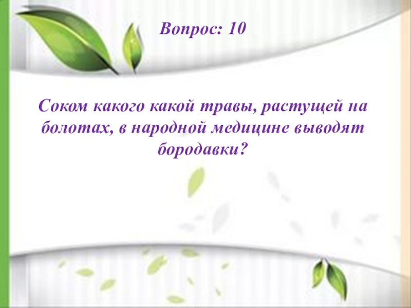 Вопрос: 10Соком какого какой травы, растущей на болотах, в народной медицине выводят бородавки?