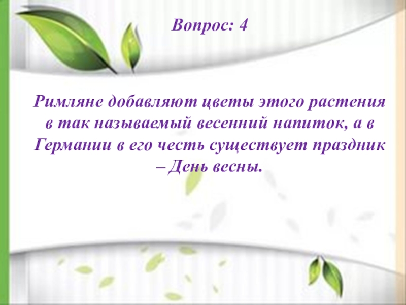 Вопрос: 4Римляне добавляют цветы этого растения в так называемый весенний напиток, а в Германии в его честь