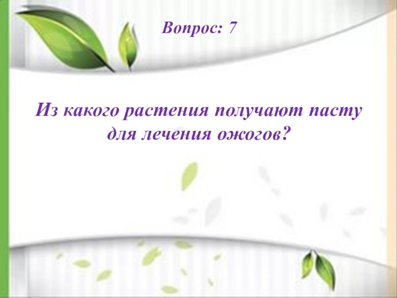 Вопрос: 7Из какого растения получают пасту для лечения ожогов?
