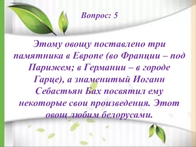 Вопрос: 5Этому овощу поставлено три памятника в Европе (во Франции – под Парижем; в Германии – в