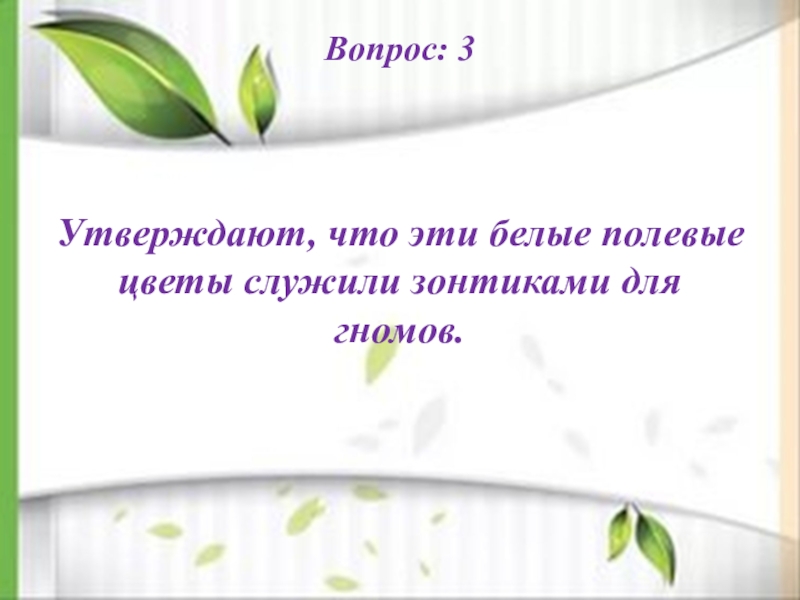 Вопрос: 3Утверждают, что эти белые полевые цветы служили зонтиками для гномов.