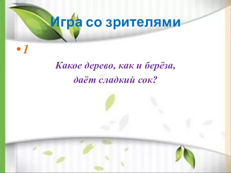 Игра со зрителями1Какое дерево, как и берёза, даёт сладкий сок?