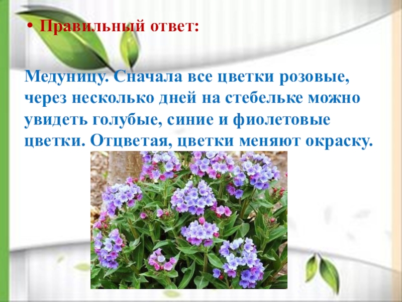 Правильный ответ: Медуницу. Сначала все цветки розовые, через несколько дней на стебельке можно увидеть голубые, синие и фиолетовые