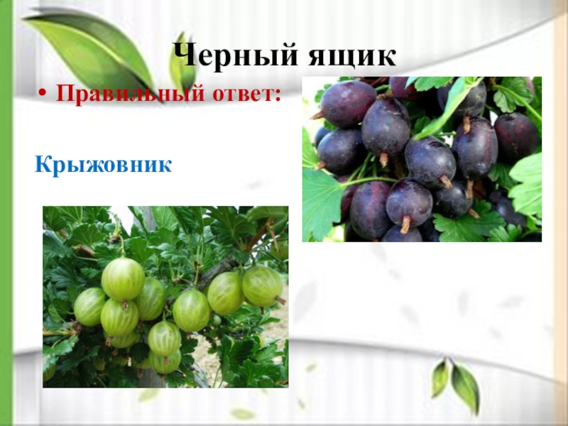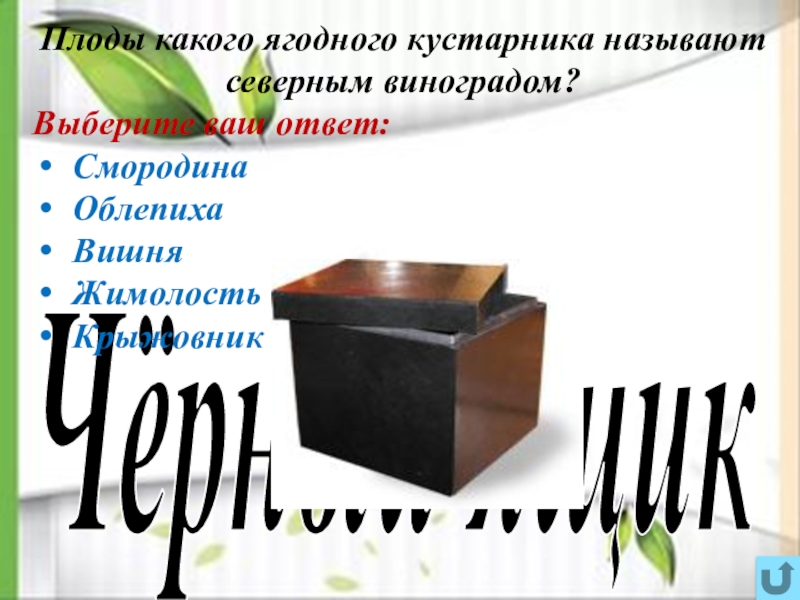 Чёрный ящикПлоды какого ягодного кустарника называют северным виноградом?Выберите ваш ответ:Смородина ОблепихаВишняЖимолостьКрыжовник