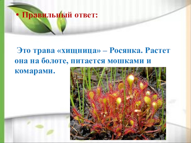 Правильный ответ:    Это трава «хищница» – Росянка. Растет она на болоте, питается мошками и комарами.