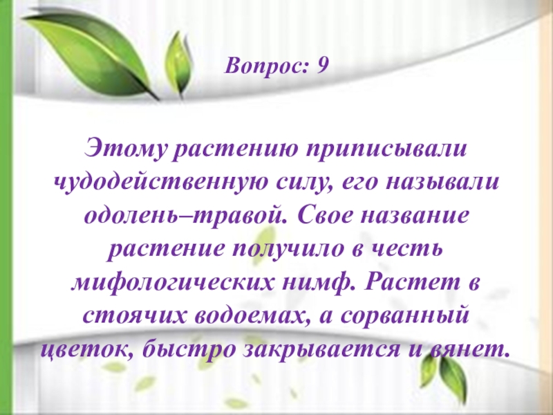 Вопрос: 9Этому растению приписывали чудодейственную силу, его называли одолень–травой. Свое название растение получило в честь мифологических нимф.