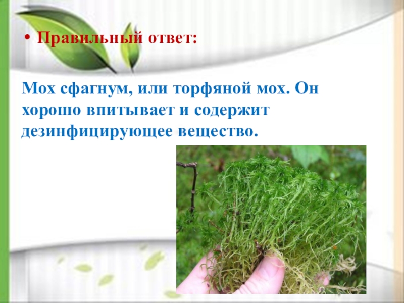 Правильный ответ: Мох сфагнум, или торфяной мох. Он хорошо впитывает и содержит дезинфицирующее вещество.