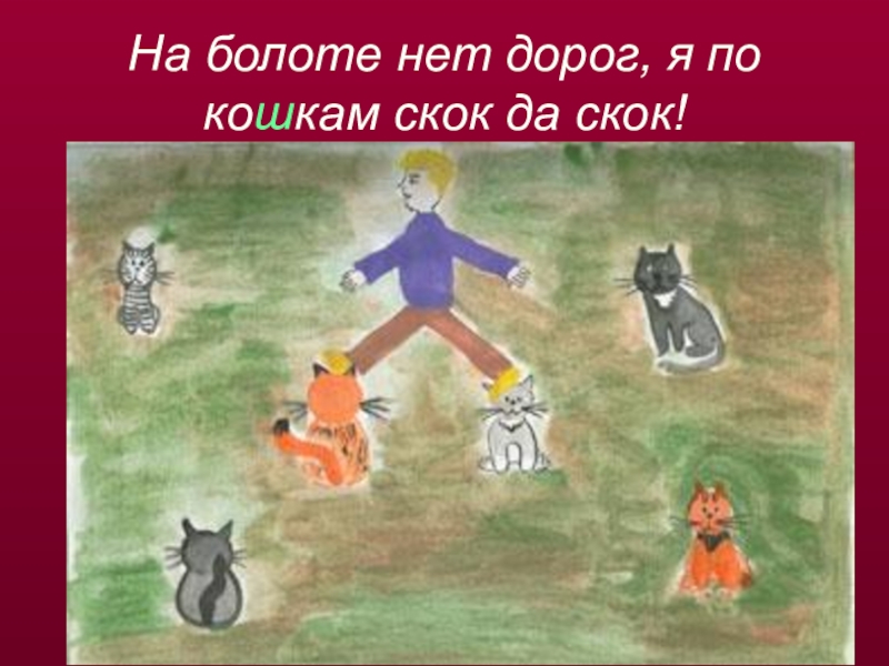 Слайд 12На болоте нет дорог, я по кошкам скок да скок!