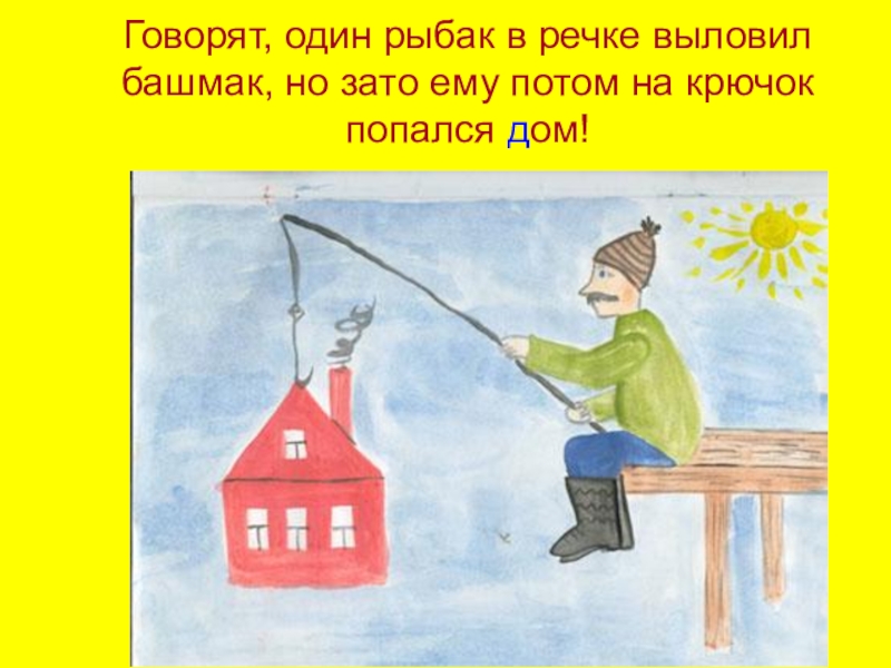 Слайд 5Говорят, один рыбак в речке выловил башмак, но зато ему потом