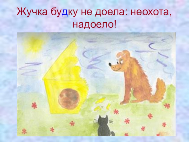 Слайд 9Жучка будку не доела: неохота, надоело!