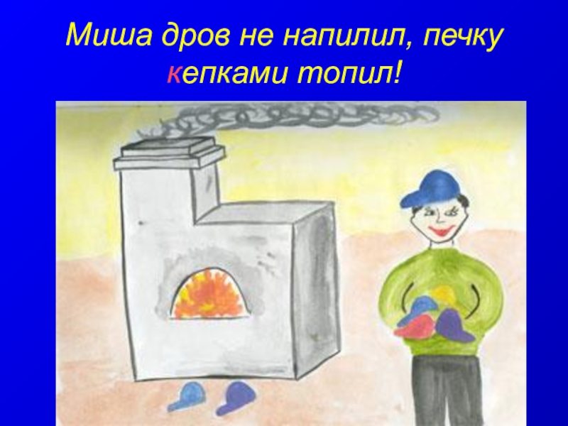 Слайд 10Миша дров не напилил, печку кепками топил!