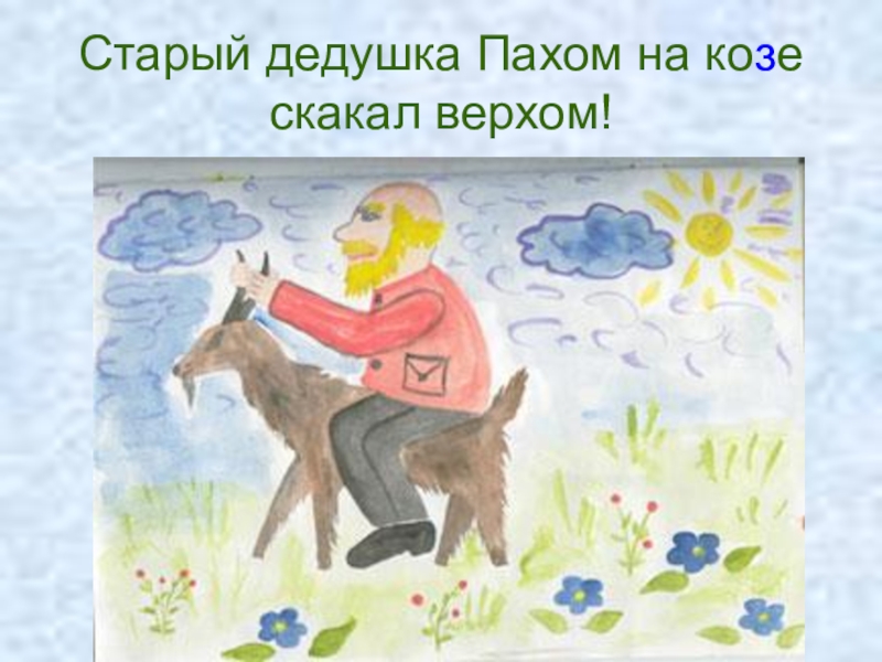 Слайд 7Старый дедушка Пахом на козе скакал верхом!