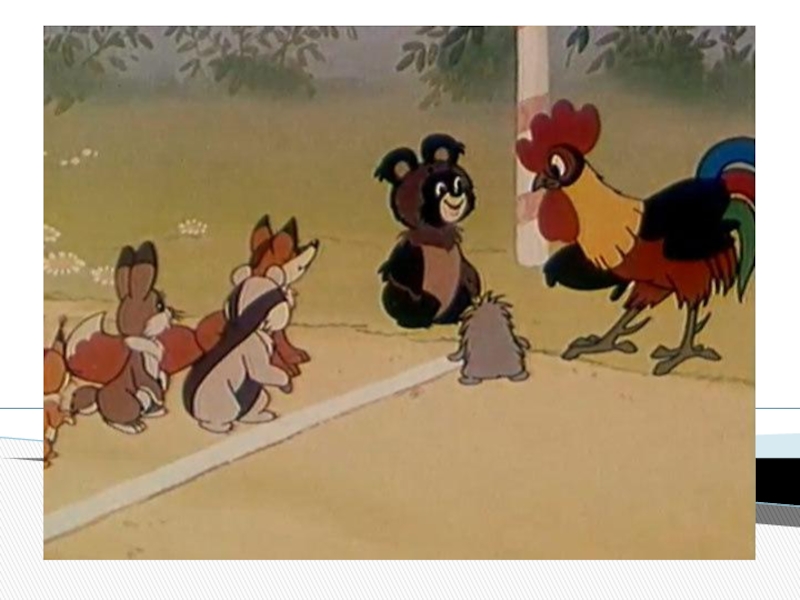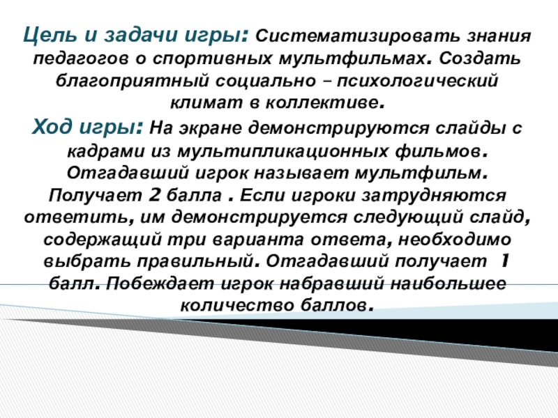 Цель и задачи игры: Систематизировать знания педагогов о спортивных мультфильмах. Создать благоприятный социально – психологический климат в коллективе. Ход игры: На экране демонстрируются слайды с кадрами из мультипликационных фильмов. Отгадавший игрок называет мультфильм. Получает 2
