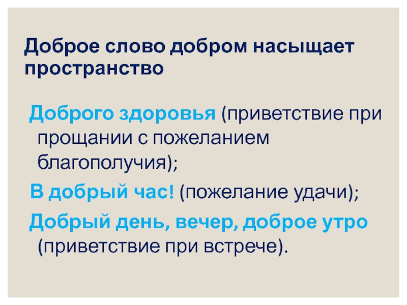 Доброе слово добром насыщает пространствоДоброго здоровья (приветствие при прощании с пожеланием благополучия);В добрый час! (пожелание удачи);Добрый день,