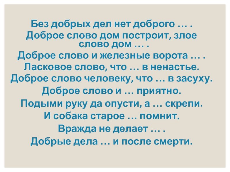 Без добрых дел нет доброго … .Доброе слово дом построит, злое слово дом … .Доброе слово и