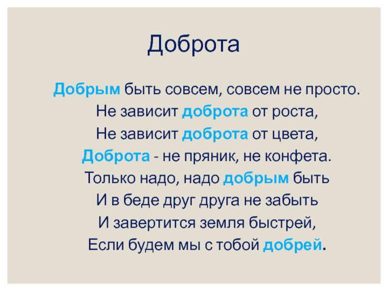 ДобротаДобрым быть совсем, совсем не просто.Не зависит доброта от роста,Не зависит доброта от цвета,Доброта - не пряник,