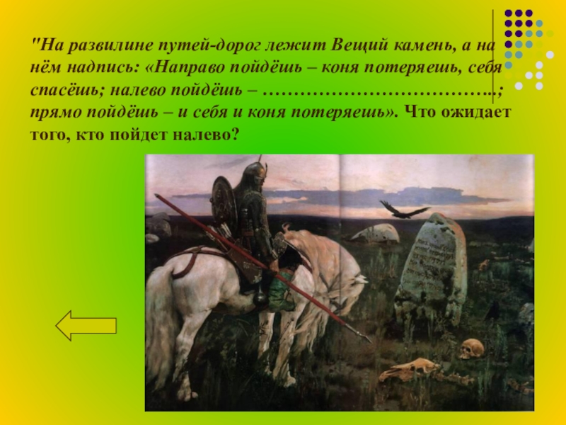 пойдёшь – коня потеряешь, себя спасёшь; налево пойдёшь – ………………………………..; прямо пойдёшь – и себя и коня потеряешь». Что ожидает того, кто пойдет налево?