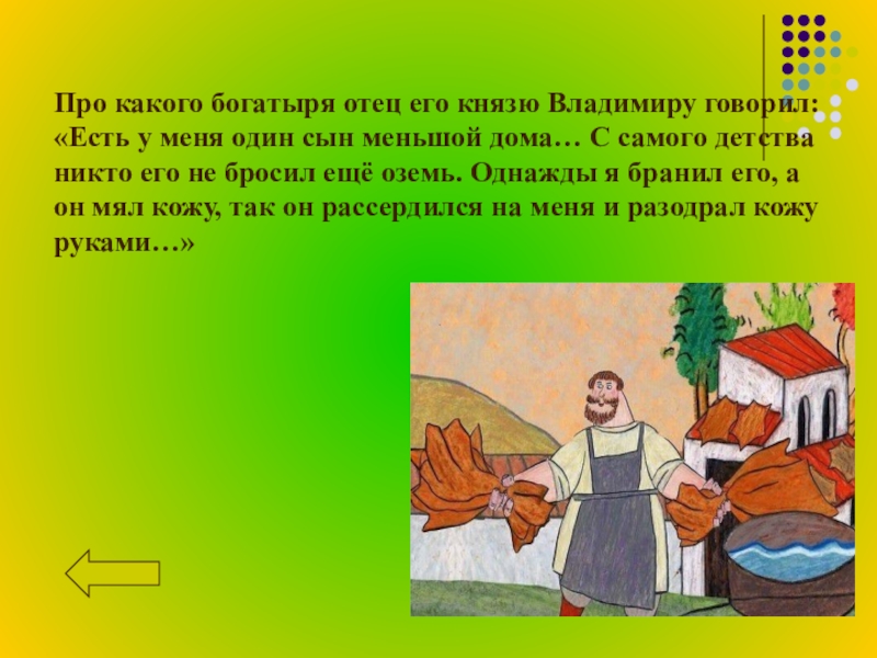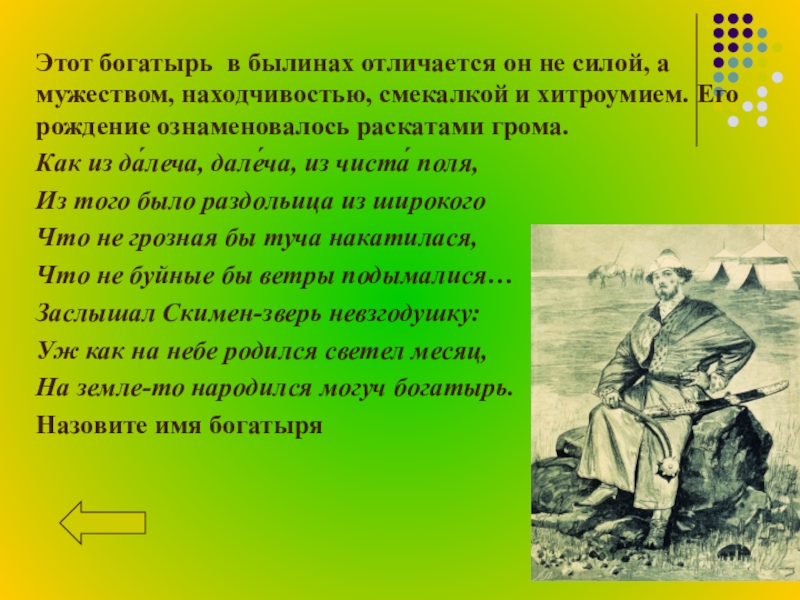 Этот богатырь в былинах отличается он не силой, а мужеством, находчивостью, смекалкой и хитроумием. Его рождение ознаменовалось