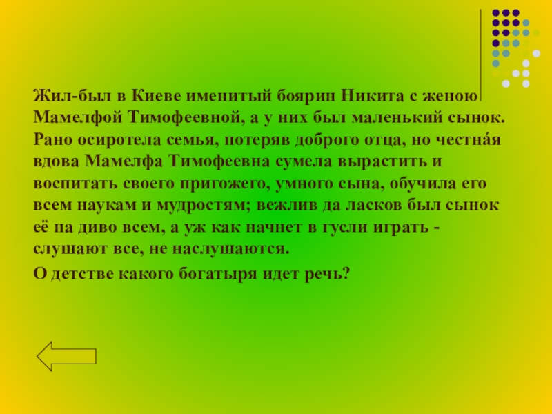 Жил-был в Киеве именитый боярин Никита с женою Мамелфой Тимофеевной, а у них был маленький сынок. Рано