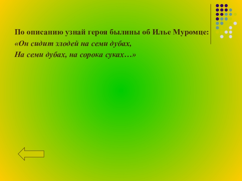 По описанию узнай героя былины об Илье Муромце:«Он сидит злодей на семи дубах,На семи дубах, на сорока