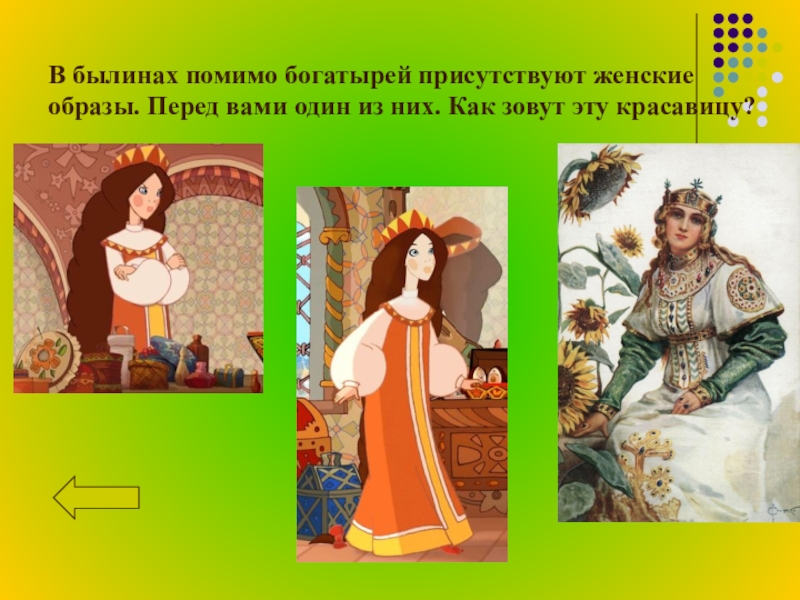 В былинах помимо богатырей присутствуют женские образы. Перед вами один из них. Как зовут эту красавицу?