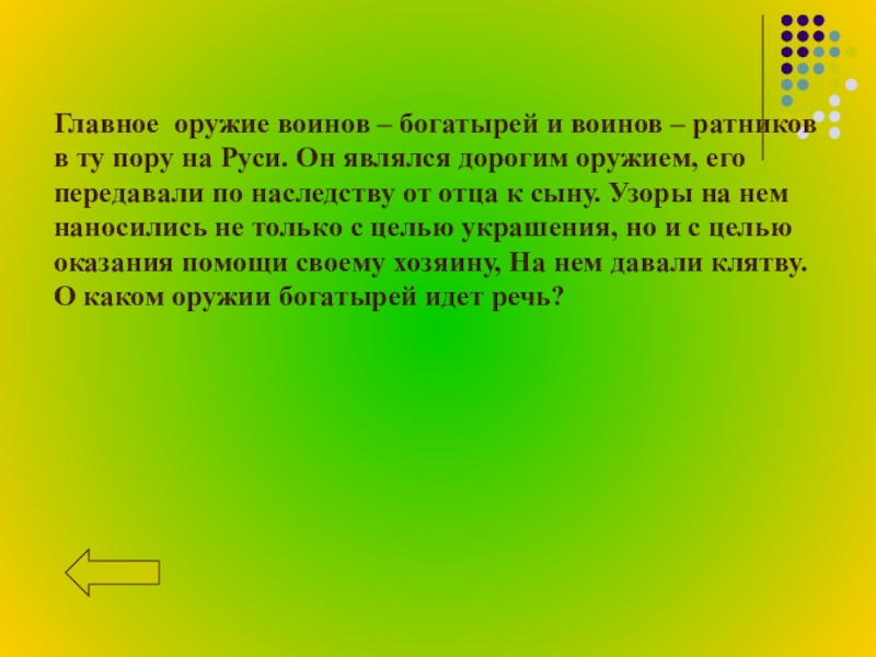 пору на Руси. Он являлся дорогим оружием, его передавали по наследству от отца к сыну. Узоры на нем наносились не только с целью украшения, но и с целью оказания помощи своему хозяину, На нем давали клятву. О каком оружии богатырей идет речь?