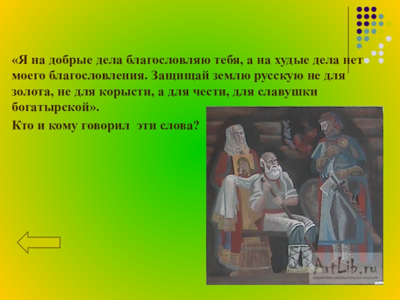 моего благословления. Защищай землю русскую не для золота, не для корысти, а для чести, для славушки богатырской».