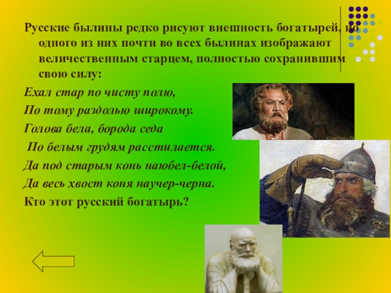 Русские былины редко рисуют внешность богатырей, но одного из них почти во всех былинах изображают величественным старцем,
