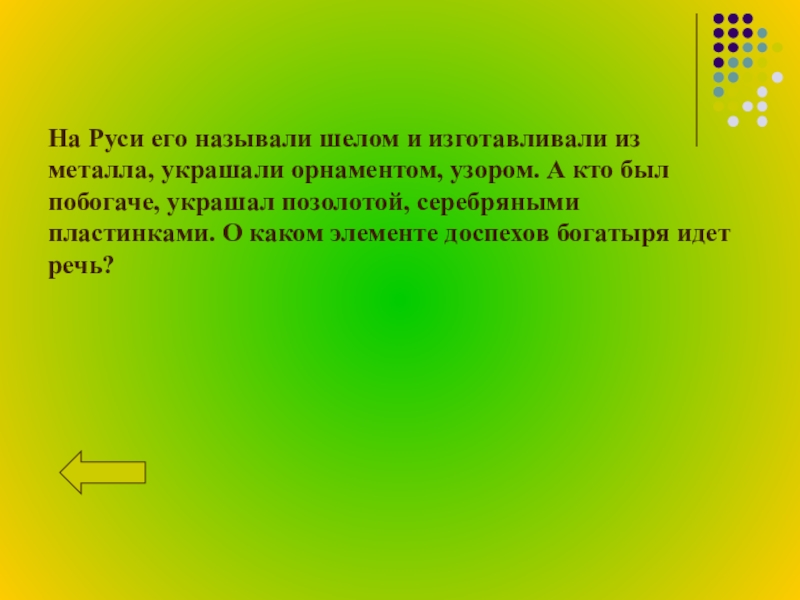 узором. А кто был побогаче, украшал позолотой, серебряными пластинками. О каком элементе доспехов богатыря идет речь?