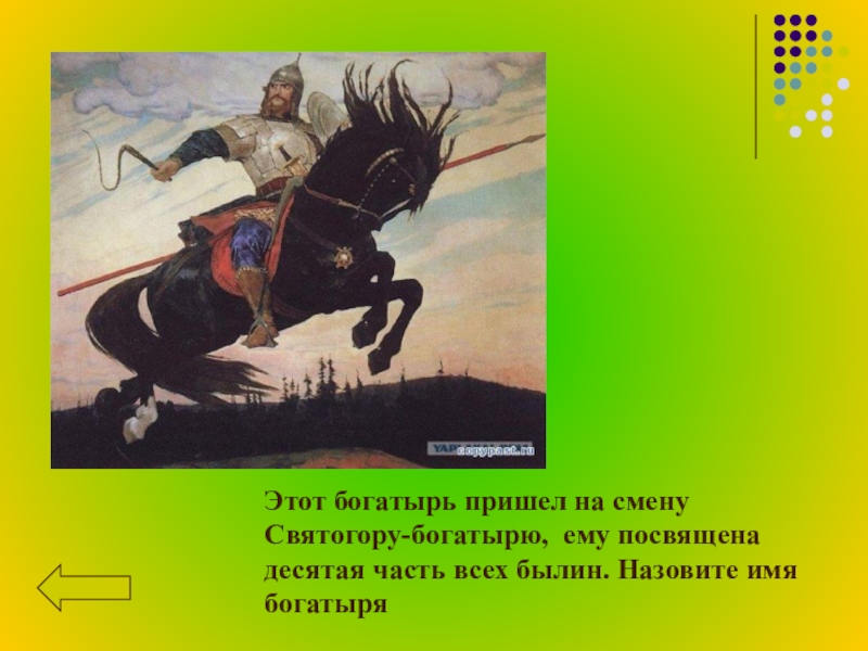 Этот богатырь пришел на смену Святогору-богатырю, ему посвящена десятая часть всех былин. Назовите имя богатыря
