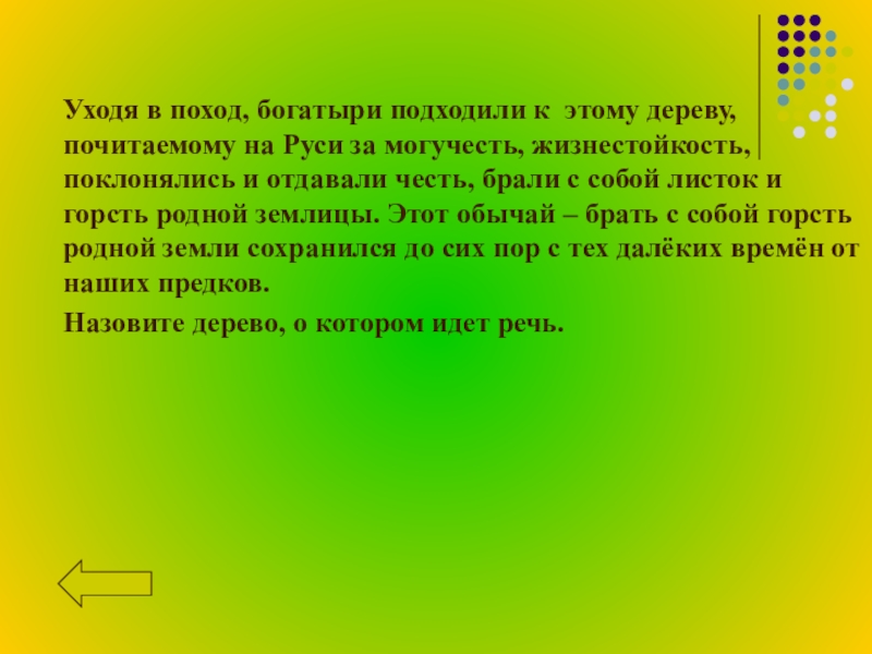 за могучесть, жизнестойкость, поклонялись и отдавали честь, брали с собой листок и горсть родной землицы. Этот обычай – брать с собой горсть родной земли сохранился до сих пор с тех далёких времён от наших предков.