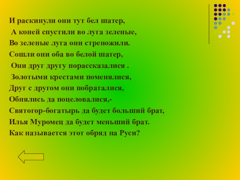 И раскинули они тут бел шатер, А коней спустили во луга зеленые, Во зеленые луга они стреножили.Сошли