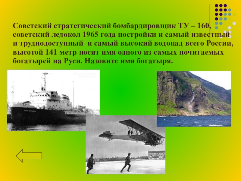 Советский стратегический бомбардировщик ТУ – 160, советский ледокол 1965 года постройки и самый известный и труднодоступный и