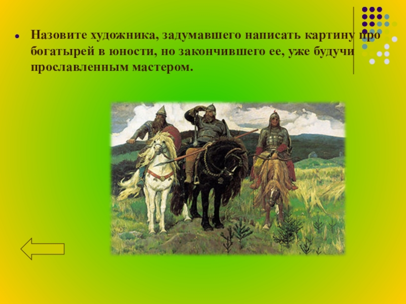 Назовите художника, задумавшего написать картину про богатырей в юности, но закончившего ее, уже будучи прославленным мастером.