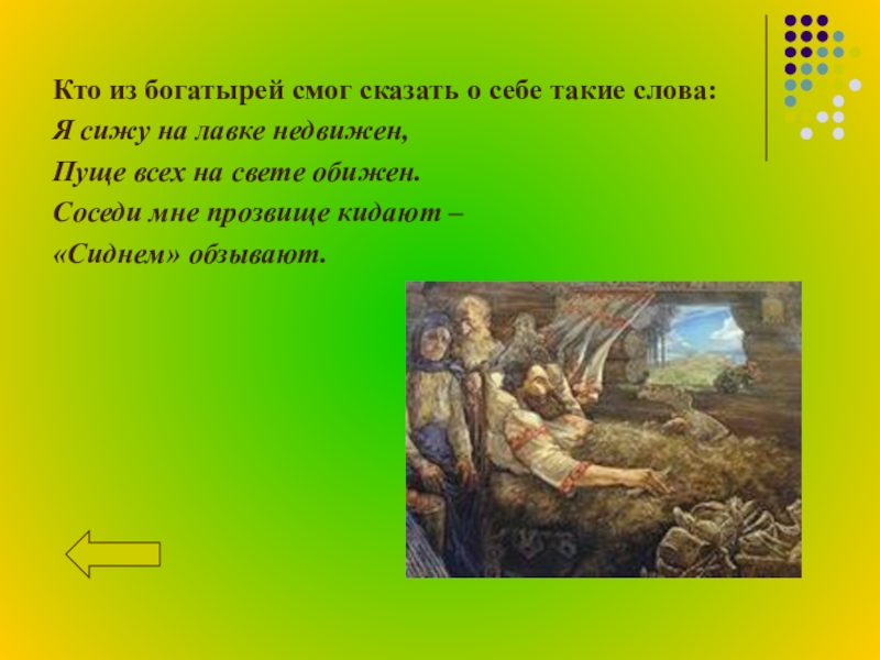 Кто из богатырей смог сказать о себе такие слова: Я сижу на лавке недвижен,Пуще всех на свете