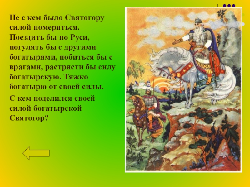 Не с кем было Святогору силой померяться. Поездить бы по Руси, погулять бы с другими богатырями, побиться