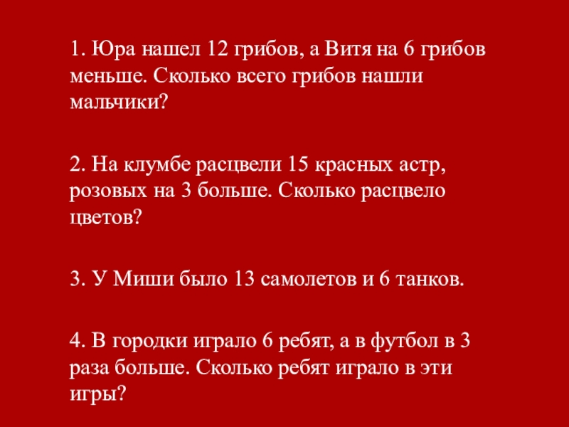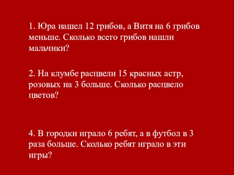 1. Юра нашел 12 грибов, а Витя на 6 грибов меньше. Сколько всего грибов нашли мальчики?2. На