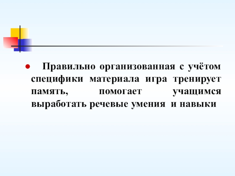Слайд 11 Правильно организованная с учётом специфики материала игра тренирует память,