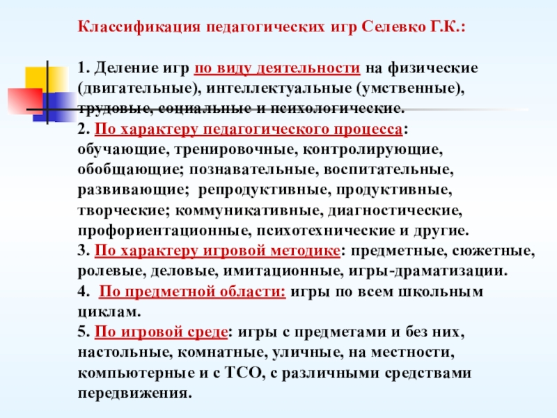 Слайд 9Классификация педагогических игр Селевко Г.К.: