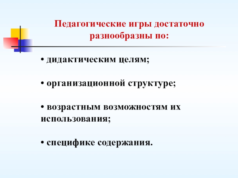 Слайд 8Педагогические игры достаточно разнообразны по: