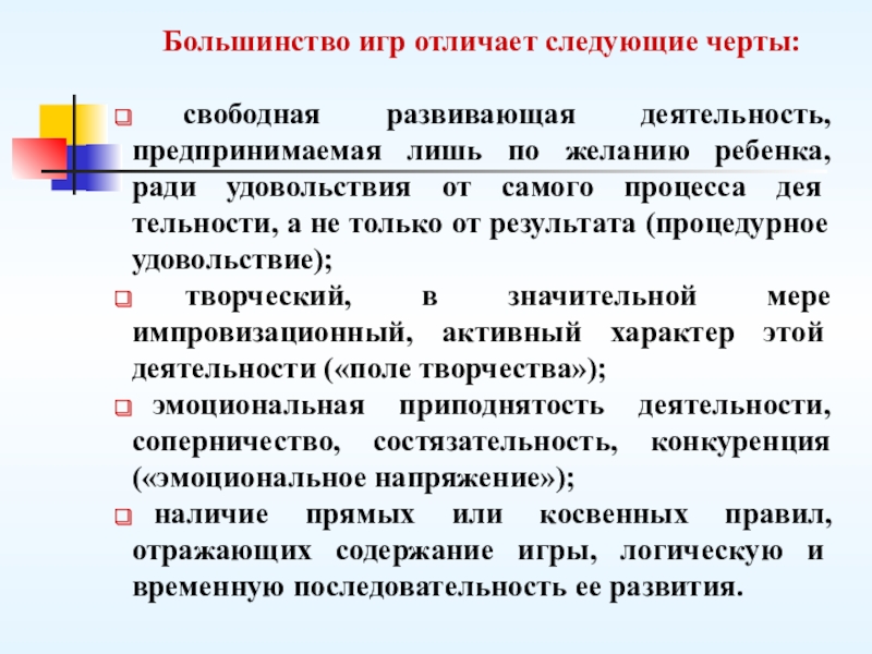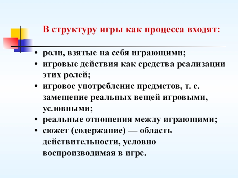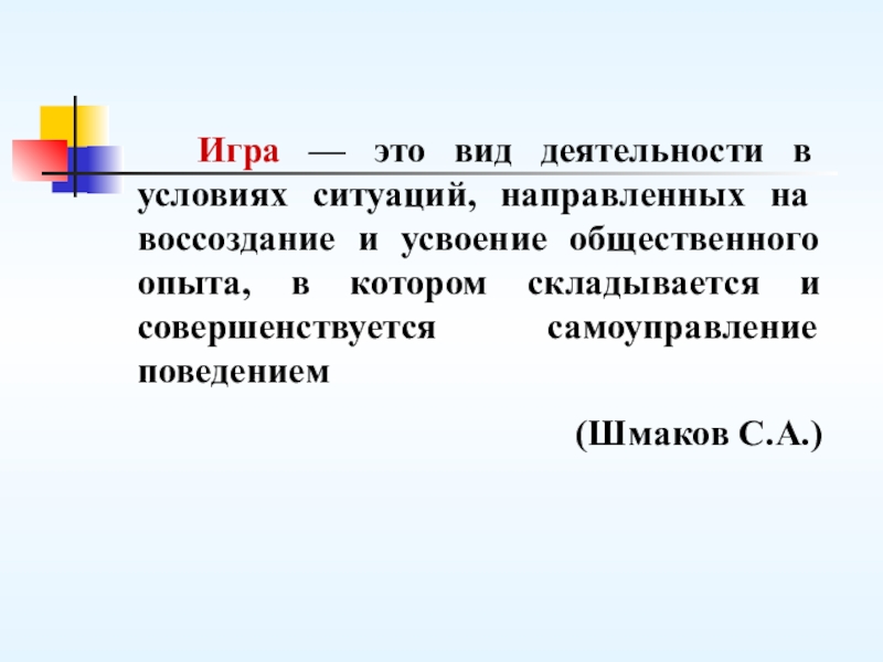 Слайд 6Игра — это вид деятельности в условиях ситуаций, направленных на воссоздание