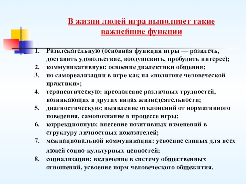 диагностическую: выявление отклонений от нормативного поведения, самопознание в процессе игры;