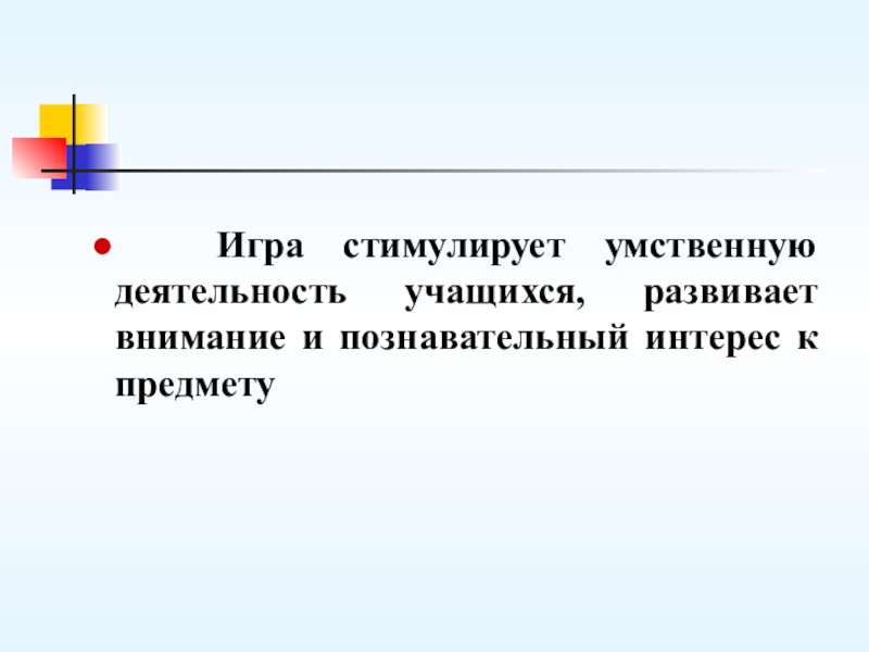 Слайд 14 Игра стимулирует умственную деятельность учащихся, развивает внимание и познавательный