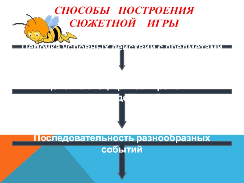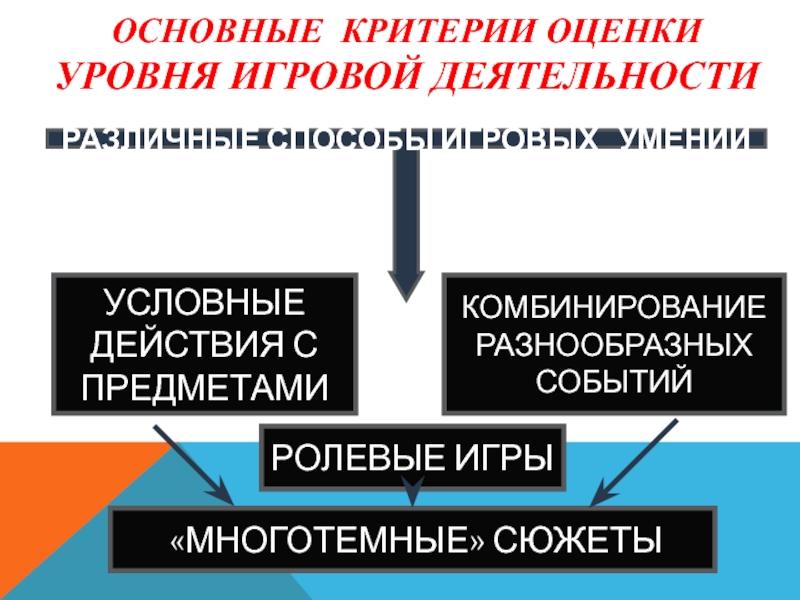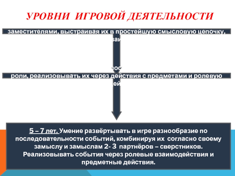 5 – 7 лет. Умение развёртывать в игре разнообразие по последовательности событий, комбинируя их согласно своему замыслу и замыслам 2- 3 партнёров – сверстников. Реализовывать события через ролевые взаимодействия и предметные действия.