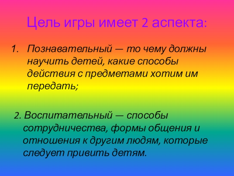 Цель игры имеет 2 аспекта: Познавательный — то чему должны научить детей, какие способы действия с предметами хотим им передать;2. Воспитательный — способы сотрудничества, формы общения и отношения к другим людям, которые следует привить детям.