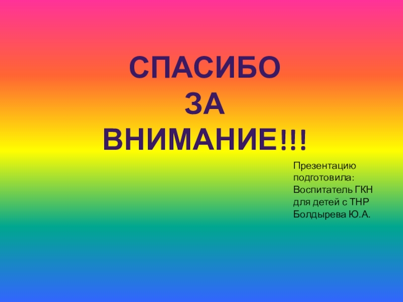 Спасибо за внимание!!!Презентацию подготовила: Воспитатель ГКН для детей с ТНР Болдырева Ю.А.