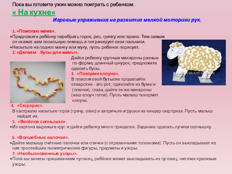 Предложите ребёнку перебрать горох, рис, гречку или пшено. Тем самым