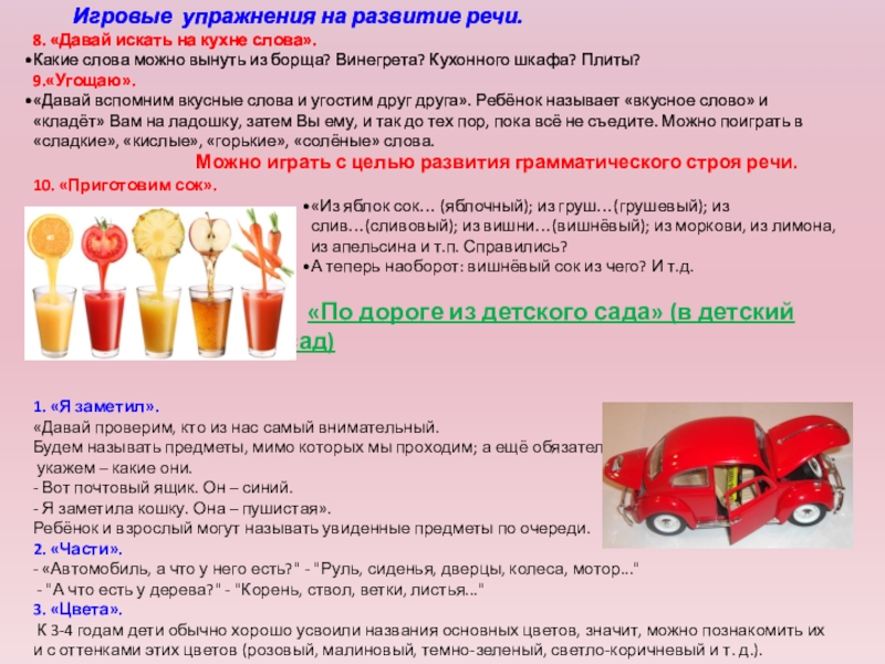 «Из яблок сок… (яблочный); из груш…(грушевый); из слив…(сливовый); из вишни…(вишнёвый); из моркови, из лимона, из апельсина и т.п. Справились?
