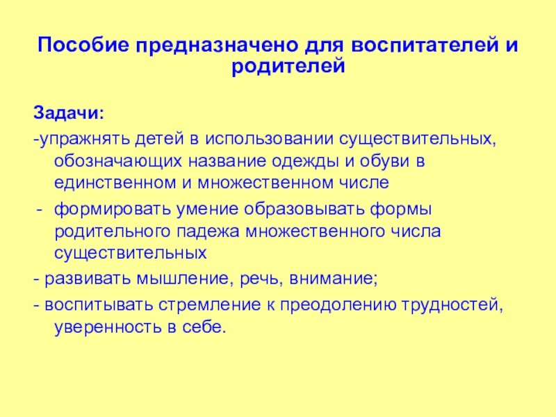Пособие предназначено для воспитателей и родителейЗадачи: -упражнять детей в использовании существительных, обозначающих название одежды и обуви в единственном и множественном числеформировать умение образовывать формы родительного падежа множественного числа существительных- развивать мышление, речь, внимание; - воспитывать стремление